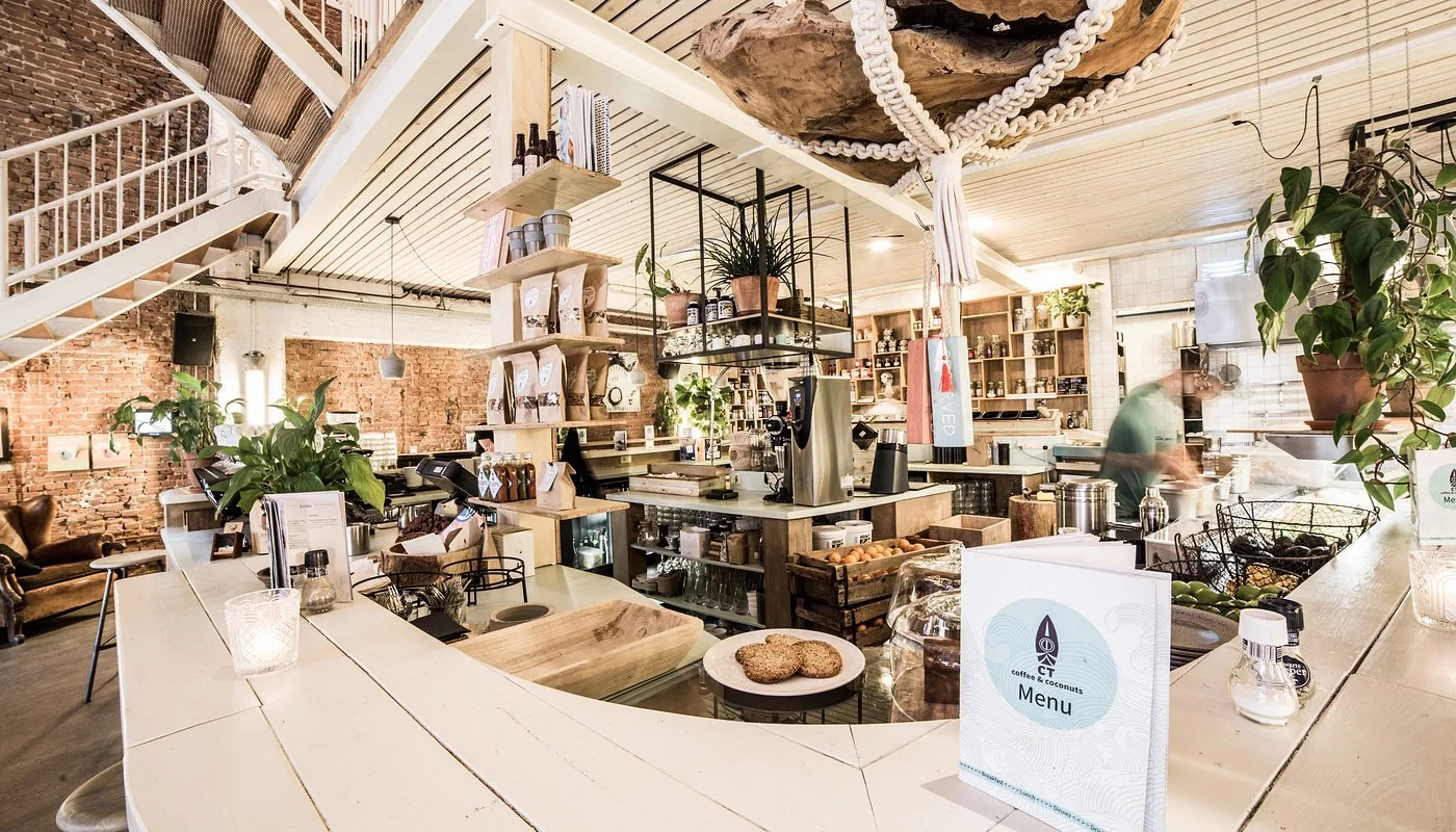 Een tropisch paradijs in hartje Amsterdam. Coffee & Coconuts zit in een voormalig theater aan de Ceintuurbaan en biedt naast heerlijke koffie ook vers kokoswater, homemade taartjes en veel ruimte om te werken of te relaxen. Deze koffiebar in Amsterdam is geliefd onder zowel locals als toeristen.